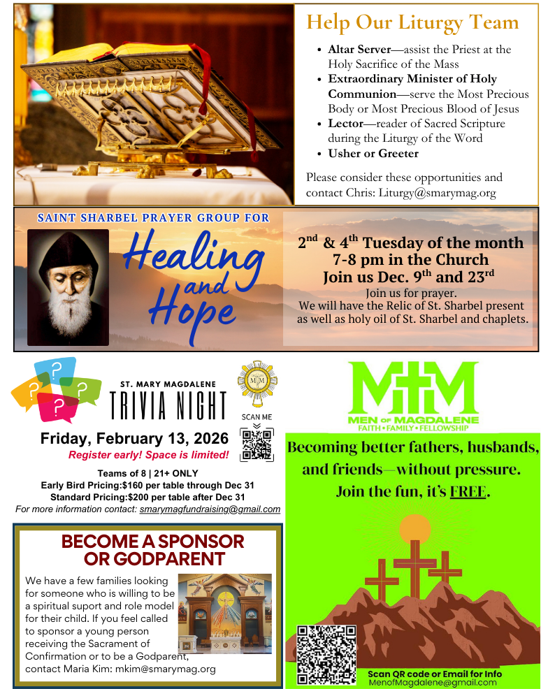 - Holy Day of Obligation Mass Times: 6:30am, 8:00am & 6:00pm