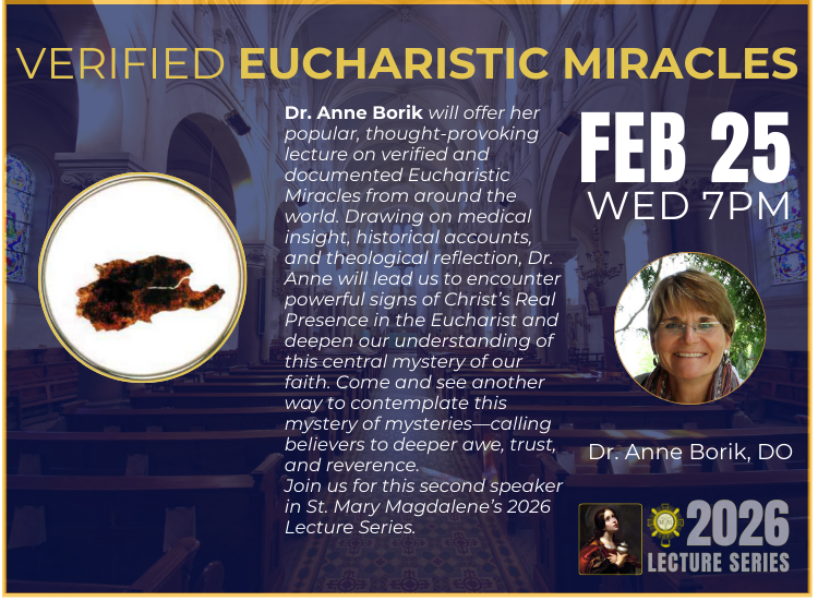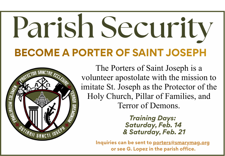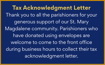 Beginning in the month of Febuary, at the end of each month, all items left in the lost and found will be donated. Please see the parish office to check for lost items. Regular office hours are Monday through Thursday from 9:00am - 1:00pm.
